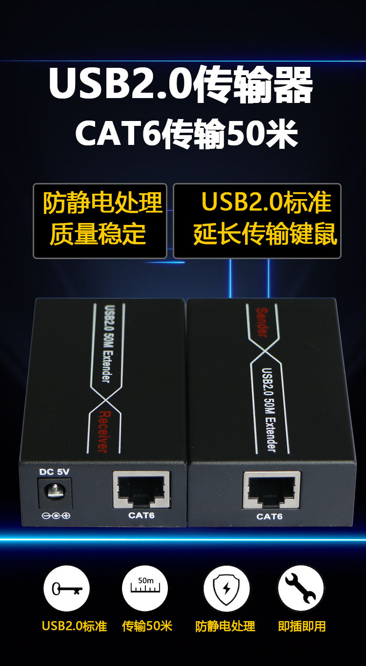 USB2.0延長(zhǎng)器包括本地發(fā)送端(Transfer)與接收端(Receiver),可以通過(guò)單根CAT5/5e/6網(wǎng)線,將電腦的USB信號(hào)延長(zhǎng)50米。傳輸速率高達(dá)480Mbps。該產(chǎn)品廣泛應(yīng)用于電腦長(zhǎng)距離連接打印機(jī)、掃描儀、鍵盤、鼠標(biāo) 和U盤等設(shè)備。即插即用,無(wú)需驅(qū)動(dòng)和安裝設(shè)置。