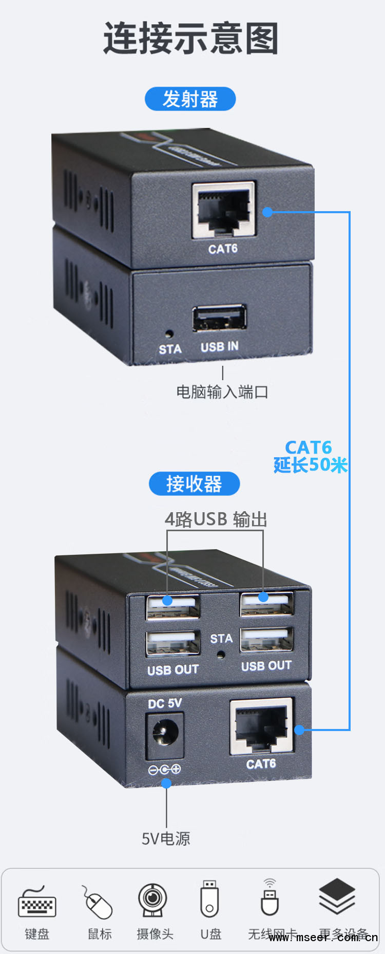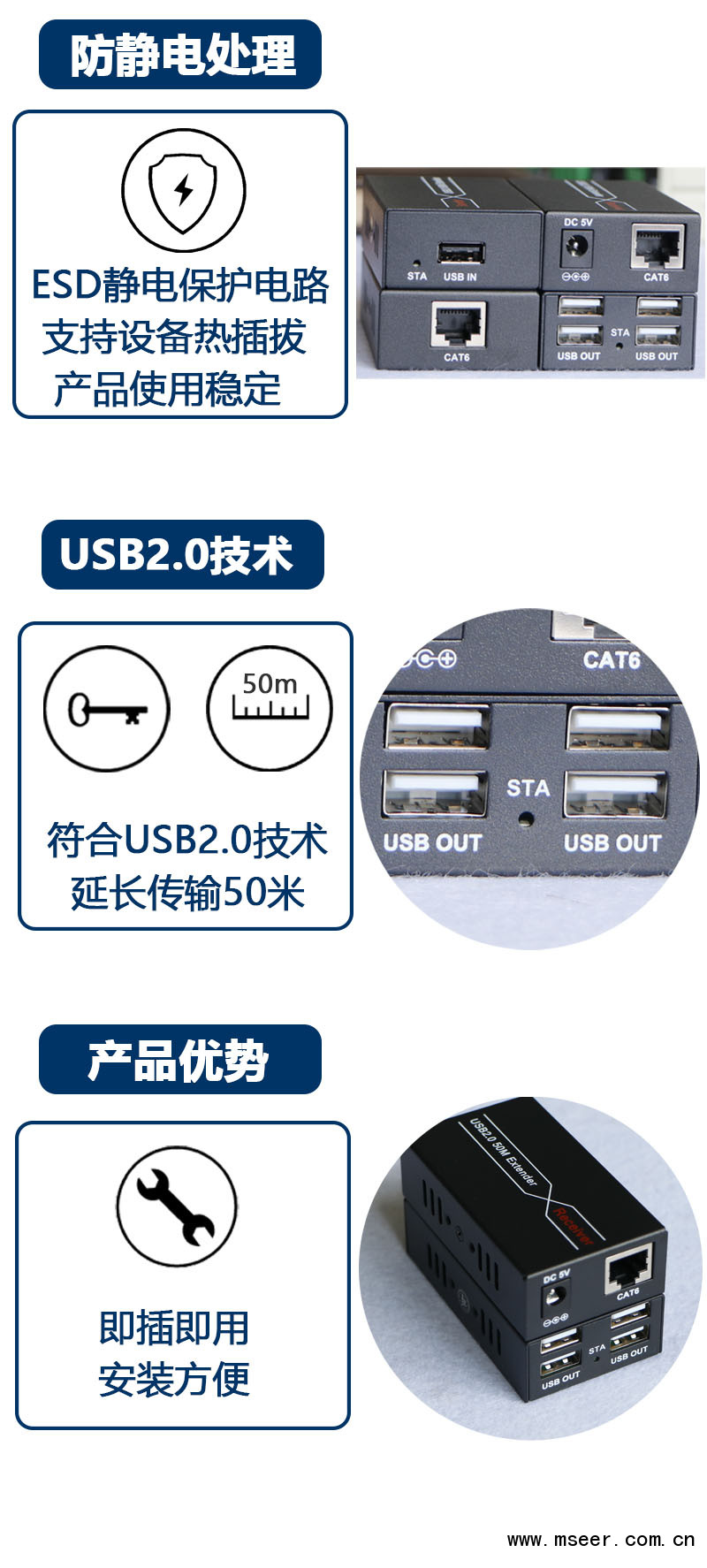 ☆支持通過(guò)單根CAT5/5e/6網(wǎng)線,將USB信號(hào)延長(zhǎng)50米